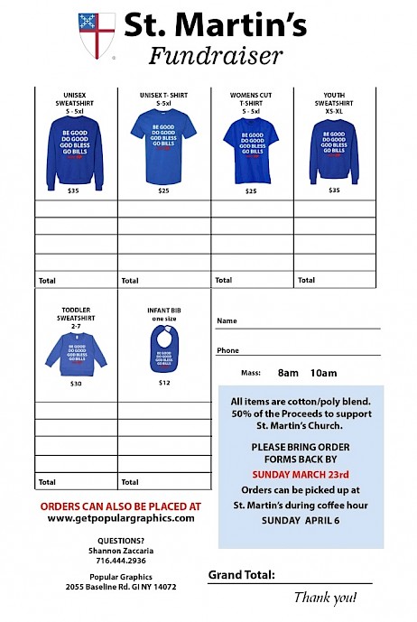 Hey St. Martin's! It's safe to say we're all pretty proud of our MVP, Josh Allen! So here's your chance to flaunt it. Our own Shannon Zaccaria has created some fabulous attire highlighting Josh's MVP speech quote, "Be good, do good, God bless, and Go Bills". Order sheets are available at church but you can also order on Shannon's website at www.getpopulargraphics.com. Orders are due by March 23. Any questions, contact Shannon at 716-444-2936.