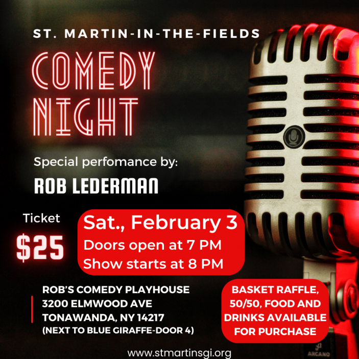 Join us for a great night out with a ton of laughs for our “Comedy Night with Rob Lederman” Fundraiser on Saturday, February 3, 2024 at “Rob’s Comedy Playhouse", 3200 Elmwood Ave. Tickets are $25 and are available Sunday mornings after services. Please contact Ellen Valvo with any questions.