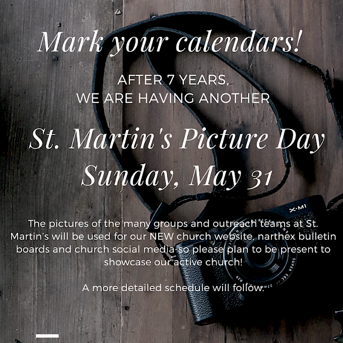 It is time to update our St. Martin's website with new pictures of the many groups and outreach teams at our church! Please block off Sunday, May 31 on your calendar as a can't miss service! We will send out a detailed schedule of when each group will meet closer to the picture day date. Please see Allie Porter with any questions.
