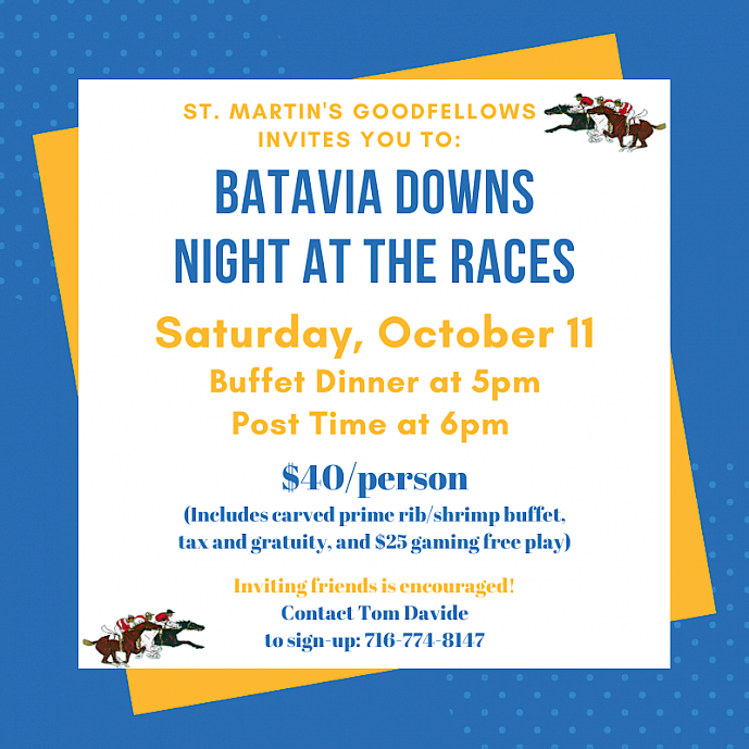 Goodfellows Presents: Batavia Downs Night at the Races! Join us on Saturday, October 11 for a night of fellowship and fun! Details on grapic below