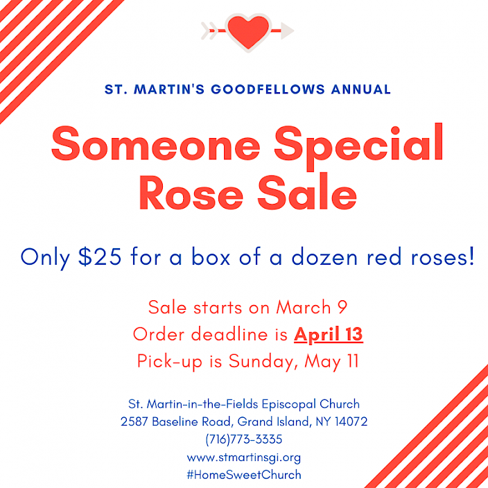 St. Martin’s will be selling roses again this year. They are not only for Mother’s Day, but can be for anyone who would love to brighten someone’s day with a dozen beautiful red roses! The roses come wrapped nicely in a long white box and cost $25. Roses will be available for pickup at church on Mother’s Day, Sunday, May 11. And here is the BEST part...you don’t have to go to the store!