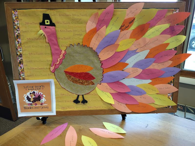 You will see a very festive Turkey in the hallway by the table that has some of the food items needed. Just choose a "feather" and bring the items to church on Sunday mornings and place themĀ in the shopping cart to help replenish our Blessing Box.
