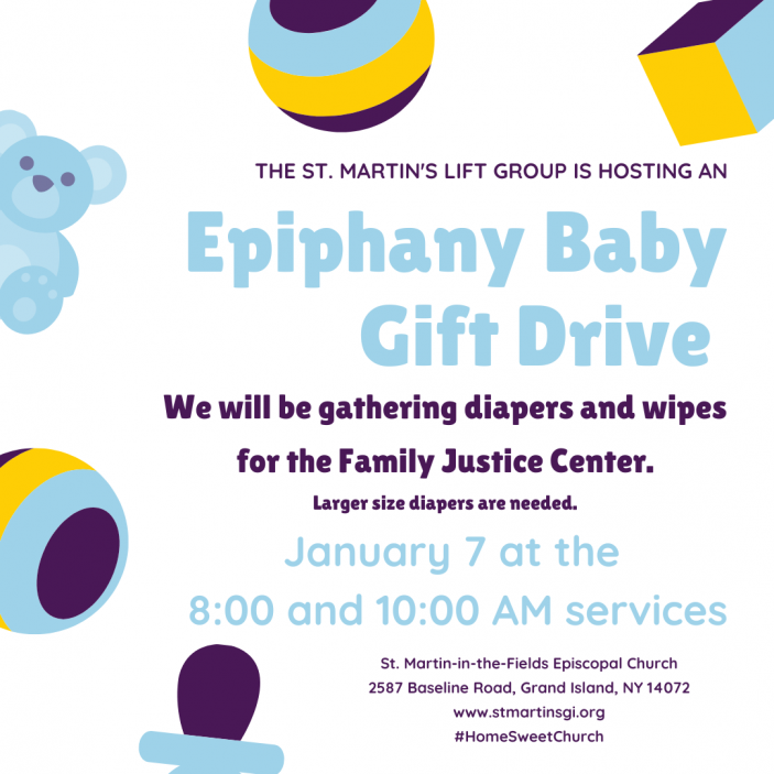 Once again this year, the LIFT group is inviting you to join in a collection of gifts for babies in our community. We will be gathering diapers (larger sizes needed) and wipes during the 8am and 10am services on Sunday, January 7. All the items we collect will be donated to those in need at the Family Justice Center.