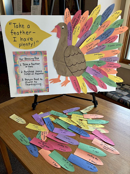 LIFT is organizing a Thanksgiving outreach to replenish our Blessing Box (the little food pantry in our circular driveway). Please take a feather or 2 off the turkey, purchase the items listed and bring to church by Thanksgiving. The best part is that your heart will be happy that you helped someone in our community with food insecurity!