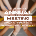 Our Annual Meeting is scheduled for Sunday, February 25 where we will be offering one combined worship service at 9am, with the Annual Meeting immediately following. At this time, elections will be held for Vestry members and Junior Warden, we will receive reports, and conduct parish business. All are encouraged to attend. Please submit the following reports to the parish office by Sunday,